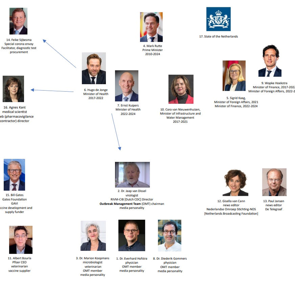 Oskarżonymi w tej sprawie są Bill Gates, Albert Bourla, Mark Rutte (obecnie Sekretarz Generalny NATO), holenderscy urzędnicy państwowi i media kontrolowane przez państwo: