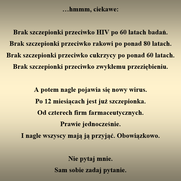 Pani doktor dodała, że jako diabetyk powinienem być wdzięczny, że medycyna mi pomaga i bez insuliny dawno bym już nie żył. To prawda, ale bez udziału mafii farmaceutycznej w blokowaniu badań, dawno bym wyzdrowiał z tej tak korzystnej dla koncernów z BigFarmy choroby.
